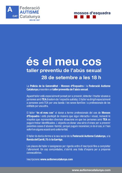 El taller «es mi cuerpo» lo llevarán a cabo profesionales del cuerpo de Mossos de Escuadra y está planteado de forma que sea interactivo y visual, incluyendo viñetas que representan diversas situaciones en las que las personas con TEA se puedan encontrar identificadas.